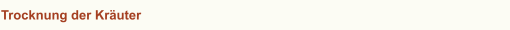 Bei der Trocknung der Kräuter ist darauf zu achten, zu welcher Zeit im Jahr die Kräuter geerntet werden sollen. Wenn man nun also ein Kraut trocknen will, muß man unbedingt darauf achten, dass es gleichmäßig und nicht in direkter Sonne trocknet. Ideal dafür ist ein trockener, gut belüfteter Dachboden oder an warmen trockenen Tagen im Sommer ein Balkon ohne direkte Sonne.